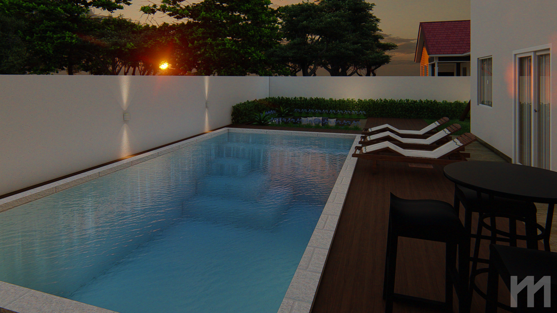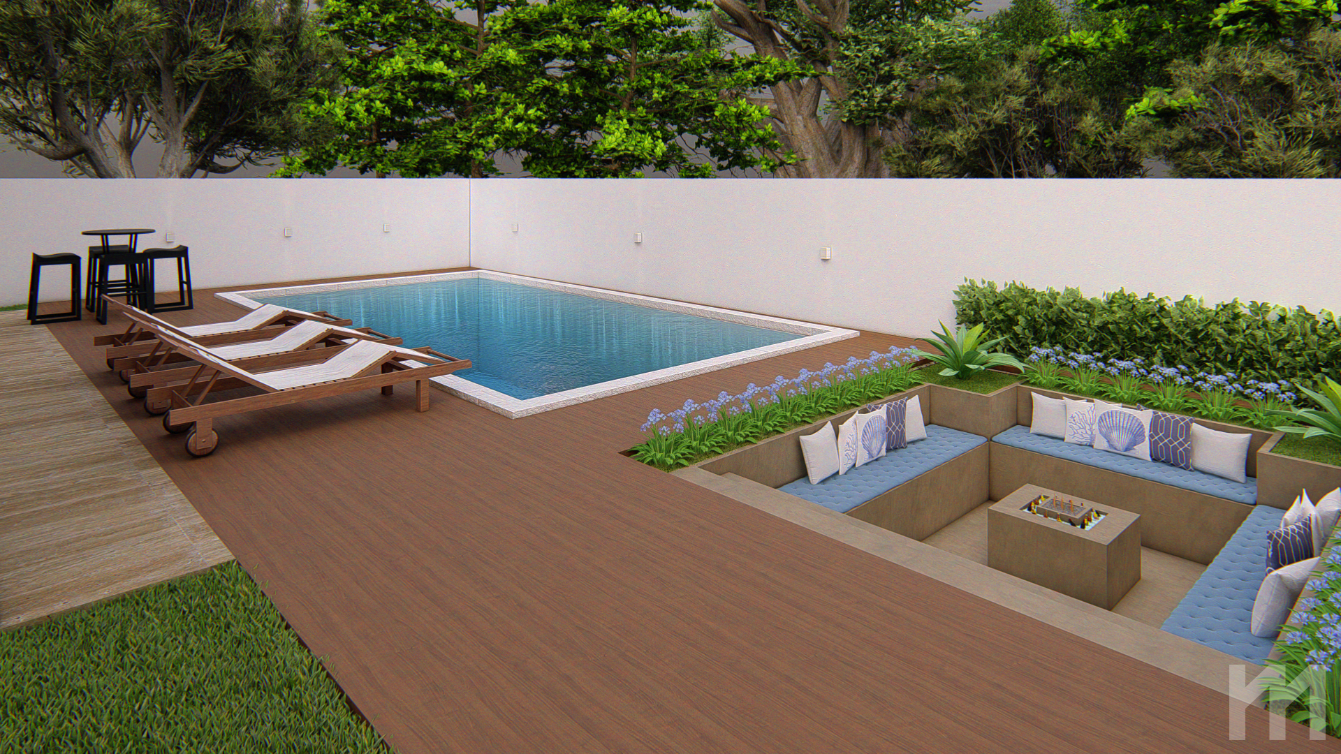 E aproveitamos o espaço no fundo do terreno, para projetar um deck com piscina, além de uma lareira externa, dando todo um charme para o espaço.