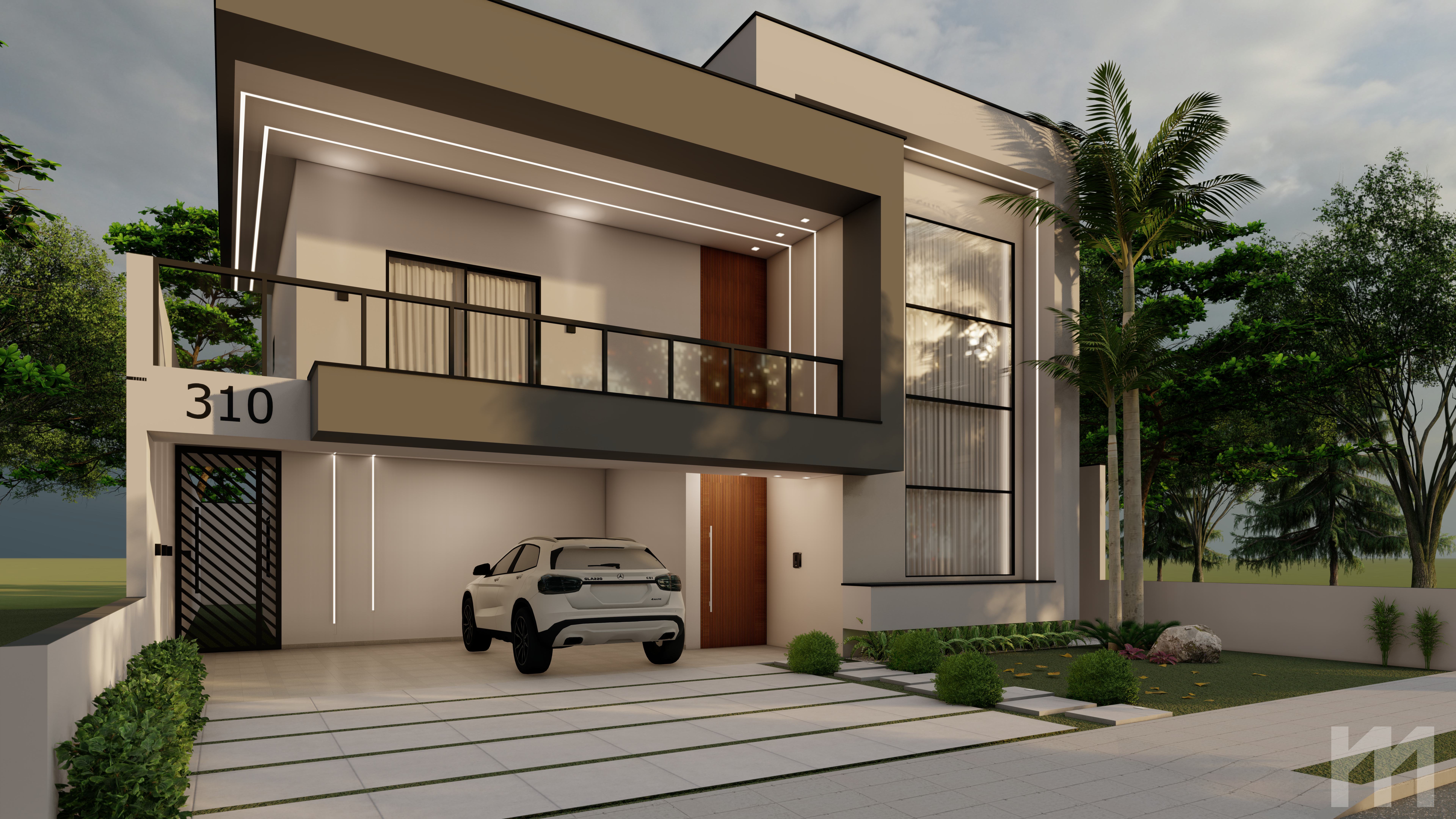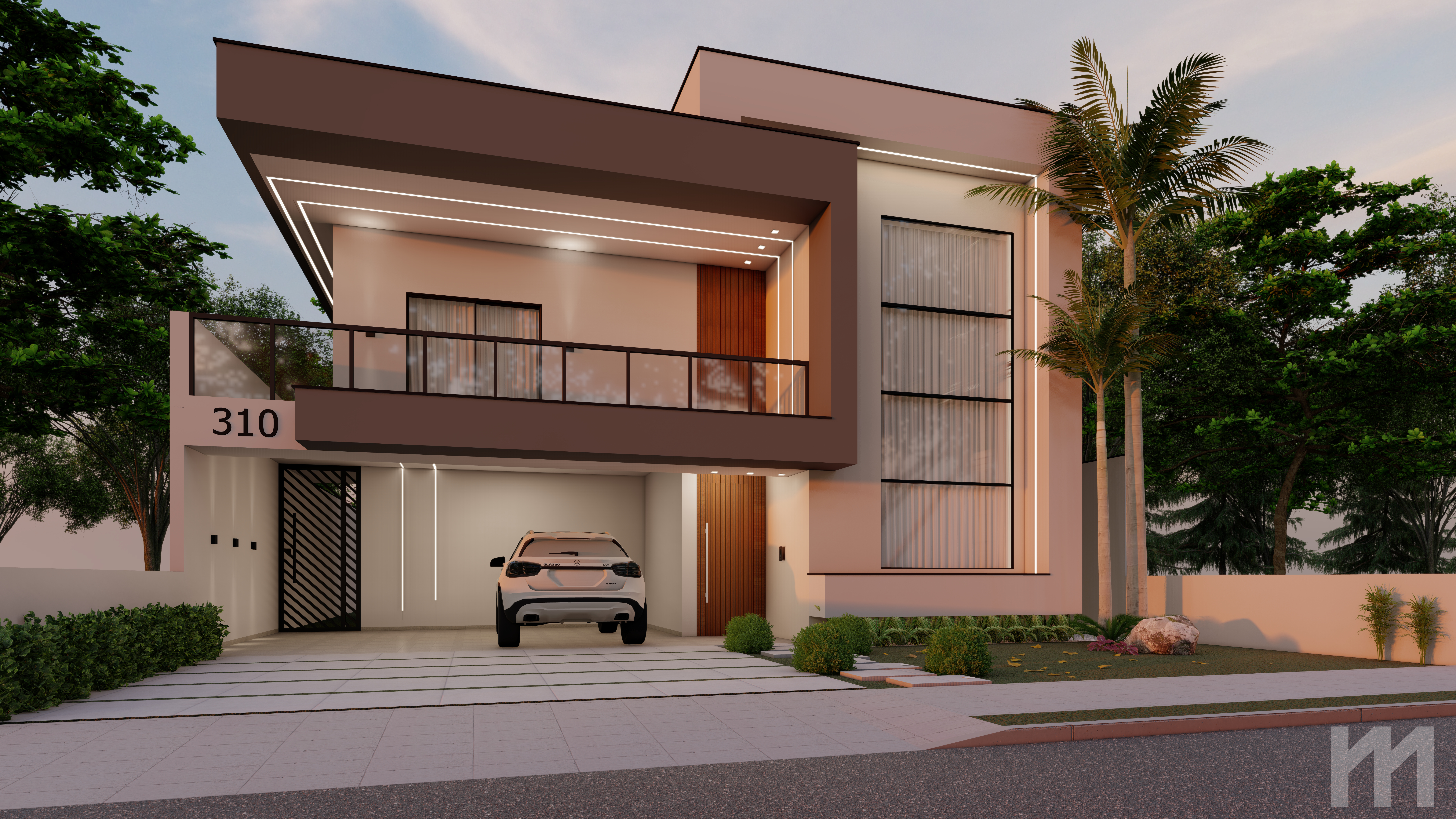 A casa conta com uma suíte ampla com closet e sacada, dois quartos, banheiro social na área superior. Já a área inferior conta com uma garagem para dois carros, sala de estar com pé direito duplo, cozinha e sala de jantar conjugada, área de serviço e um depósito.