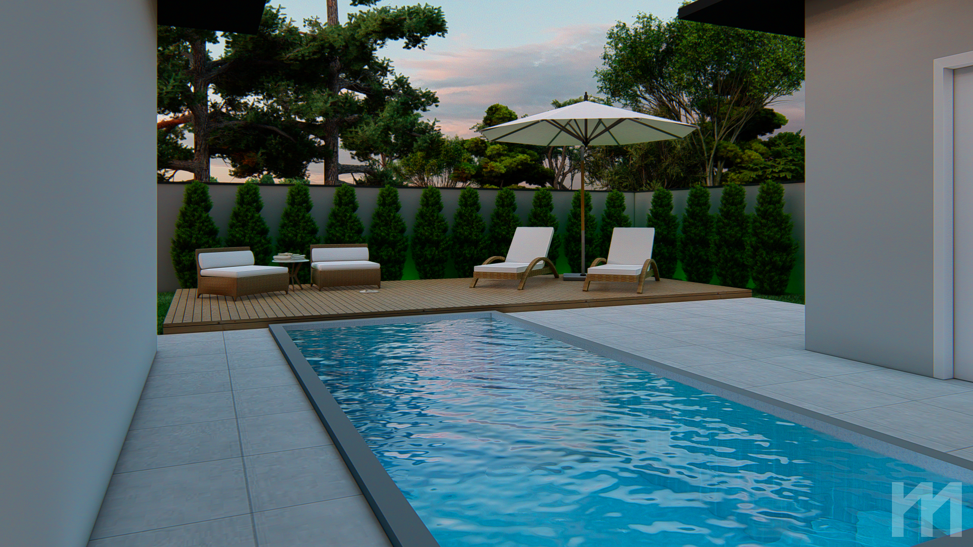 A parte exterior conta com um banheiro e área de serviço.